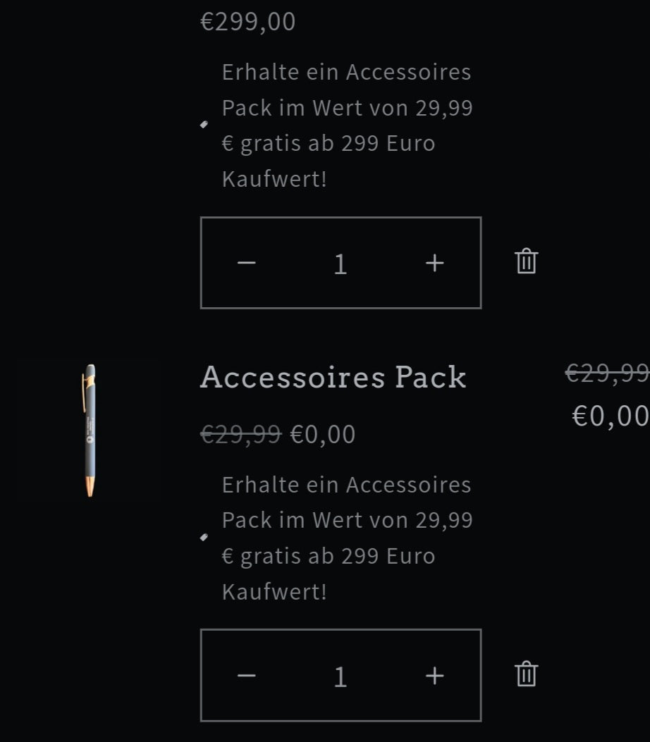 Lege hierzu einfach bei Erreichung der 299 € im Warenkorb einen Bock Industries Accessoires Pack aus der Kategorie Accessoires in den Warenkorb und erhalte dieses Gratis.